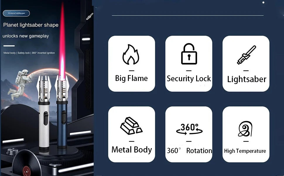 PLANET LIGHTSABER MODELING & POWERFUL FLAME - The striking Planet Lightsaber design adds a touch of sci-fi elegance to this lighter. It not only looks impressive, but also produces a powerful flame that's perfect for various applications. With its cool appearance and exquisite gift box packaging, no man can refuse such a gift.